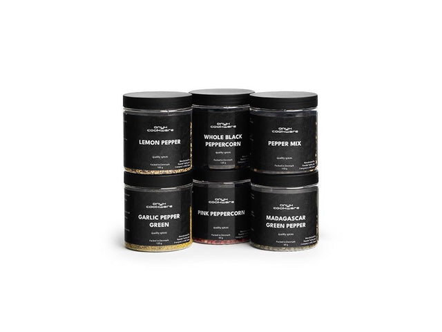 ONYX COOKWARE™ PEPPER KOMPLETT tilbyr en symfoni av smaker som imøtekommer ulike smaker og kulinariske preferanser. Du kan enkelt velge mellom seks forskjellige typer pepperblandinger, alle tilpasset dine ønsker. Uansett hvilket pepperhumør du er i, har vi deg dekket.