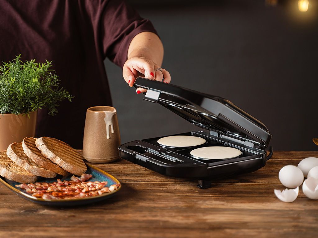 Bruk den til gyldne pannekaker, perfekt stekte speilegg eller ristede bagels – akkurat slik du liker dem. Det keramiske non-stick-belegget gjør at maten slipper lett, selv med klissete ingredienser. Perfekt når du vil ha noe varmt, enkelt og tilfredsstillende uten styr.